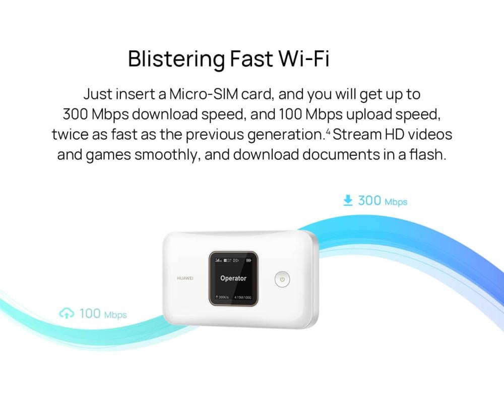 راوتر متنقل محمول من هواوي E5785 مودم الجيل الرابع، سرعة حتى 300mb/s، بطارية تعمل حتى 12 ساعة، يستقبل اتصال 32 جهاز، صغير الحجم خفيف الوزن سهل الاستخدام