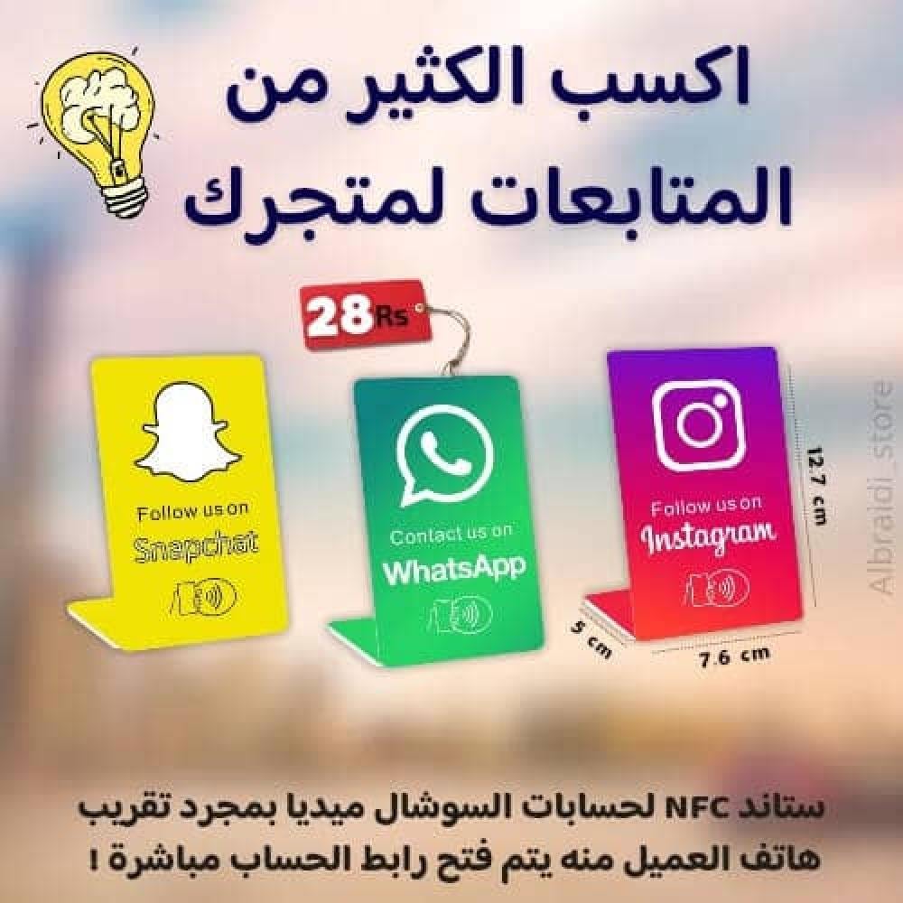 ستاند التواصل الاجتماعي بتقنية NFC - عزز حضورك الرقمي!حول كل عميل إلى متابع أو صديق باستخدام ستاند التواصل الاجتماعي بتقنية NFC! هذا الاستاند الذكي يتيح لعملائك الوصول إلى حساباتك على واتساب، إنستغرام، سناب شات، وغيرها بلمسة واحدة. كل ما يحتاجونه هو تقريب هاتفهم من الستاند لفتح رابط حسابك مباشرة، مما يسهل عليك زيادة متابعيك وتفاعلك.