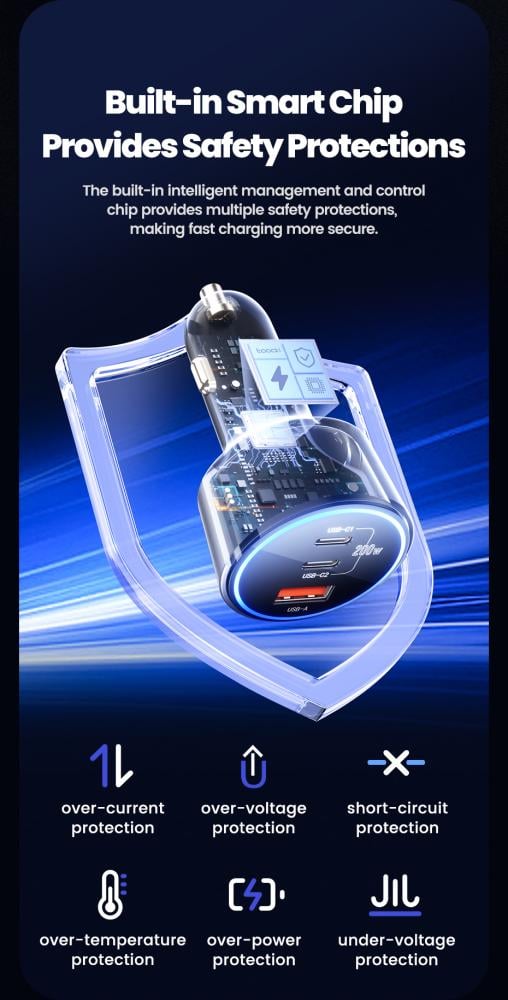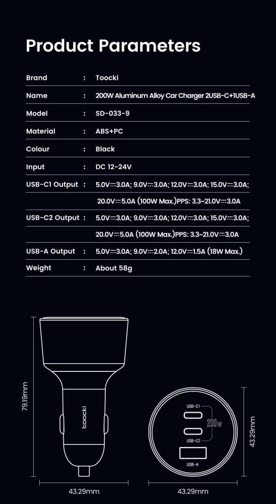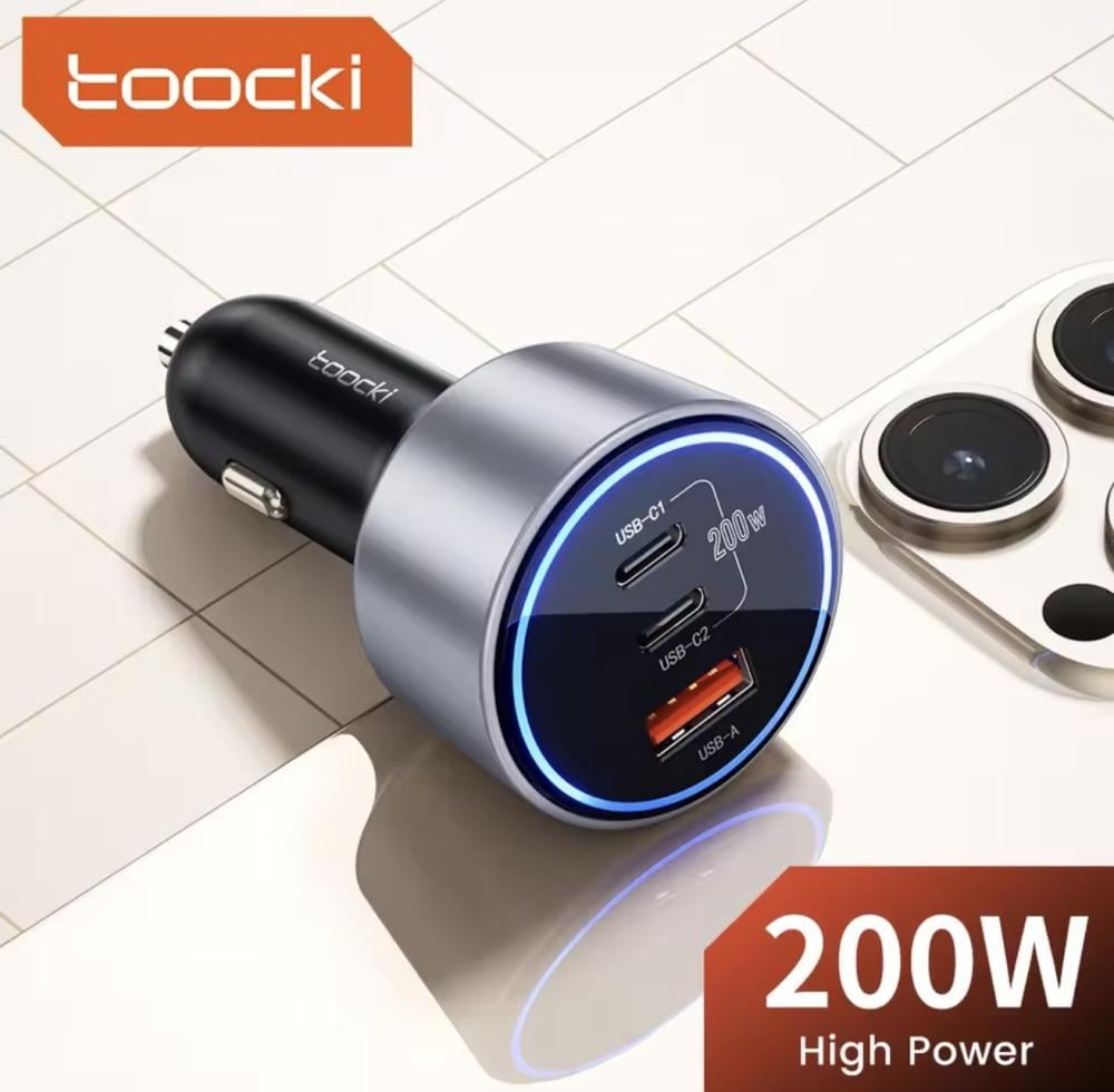 شاحن سيارة من توكي toocki سريع جدا بقدرة 200 واط وبثلاث منافذ
