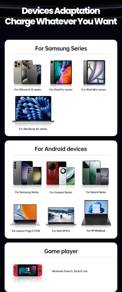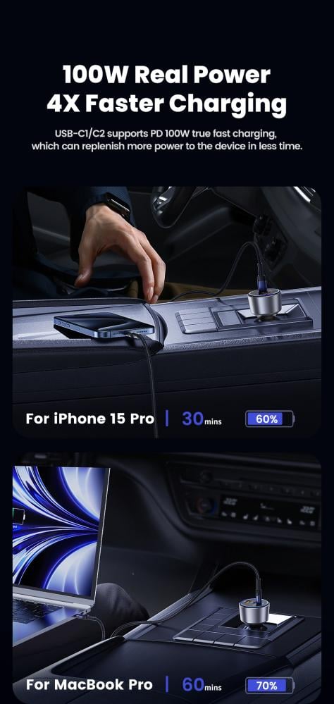 المنفذ الأول type c يشحن إلى 100 واط. مثالي لشحن أجهزة اللابتوب وشحن الجوالات والأجهزة اللوحية بأقصى سرعة ممكنة