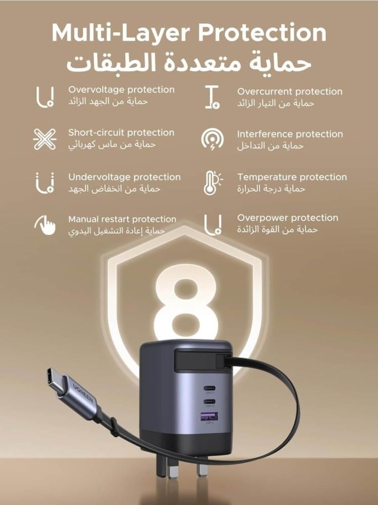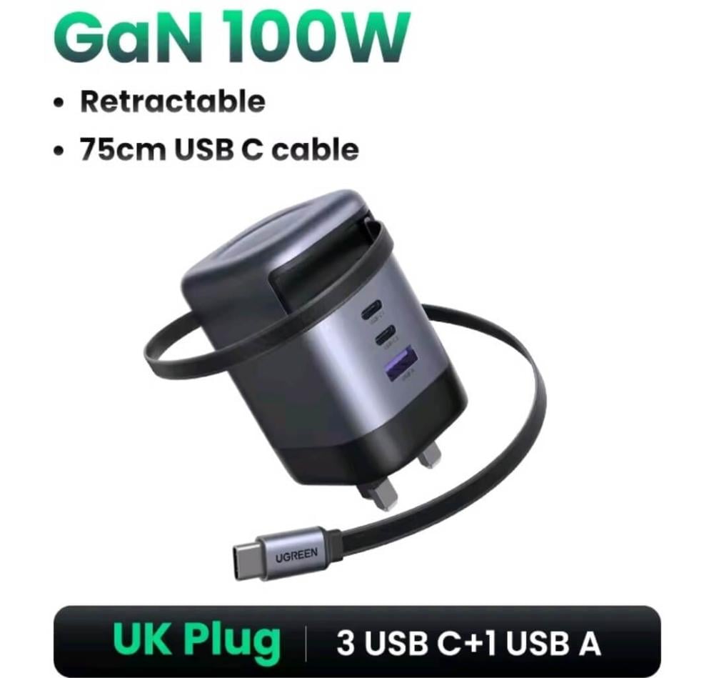 شاحن Ugreen GaN 100 واط مع كيبل مدمج سريع جدا - الحل الأمثل للشحن السريع والآمن