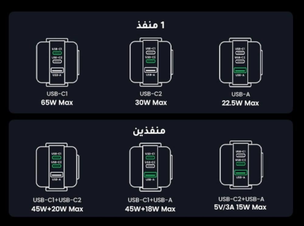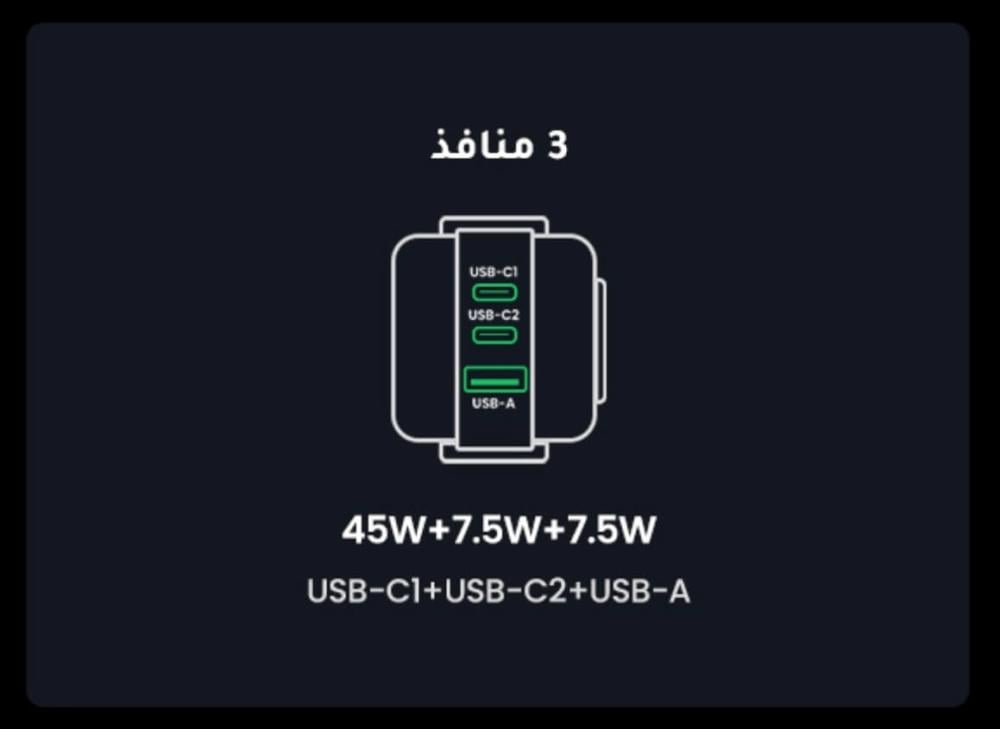【3 منافذ USB، المزيد من الخيارات】مع منفذي USB C ومنفذ USB A، شحن سريع لثلاثة من أجهزتك باستخدام نظام توزيع تيار ذكي. ما عليك سوى تشغيل جهاز MacBook وiPhone وAirPods في الوقت نفسه!