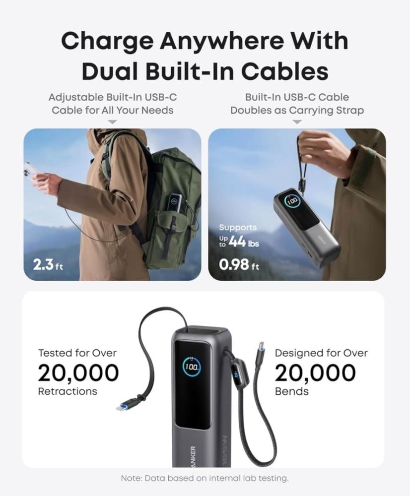 كابلات مدمجة مزدوجة للاستخدام أثناء التنقل: استمتع براحة كابلين USB نوع سي مدمجين، قابل للسحب حتى 2.5 قدم ومضاعفة كحزام حمل قوي. مصممة لتحمل أكثر من 17000 انحناء ودعم ما يصل إلى 44 باوند.