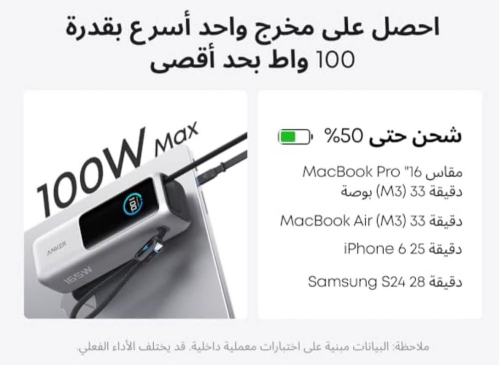 ما تحصل عليه: باور بانك انكر (25K، 165W، كابلات مدمجة وقابلة للسحب)، دليل ترحيب، ضمان لمدة 24 شهرًا، وخدمة عملاء ودودة.