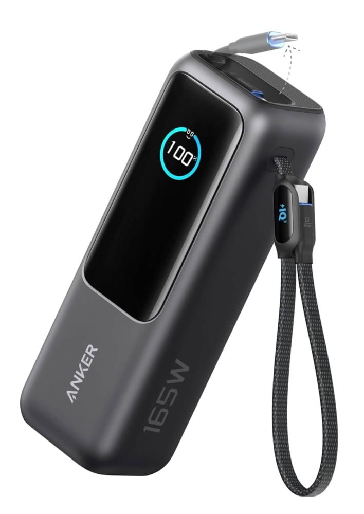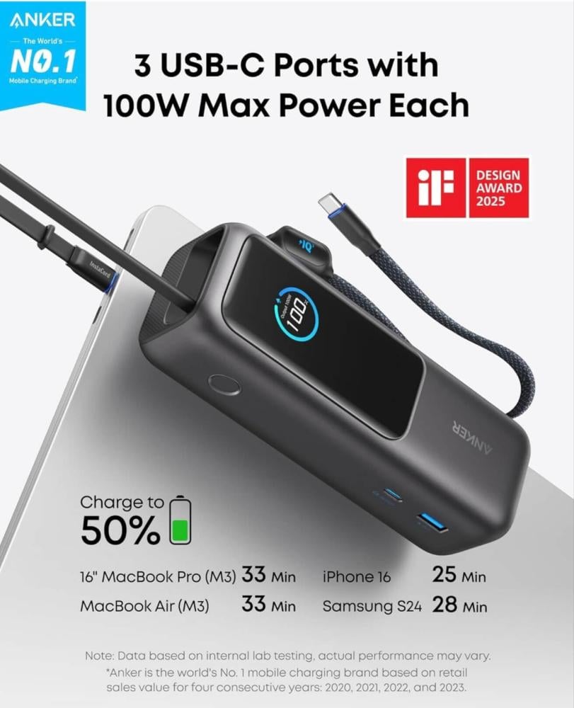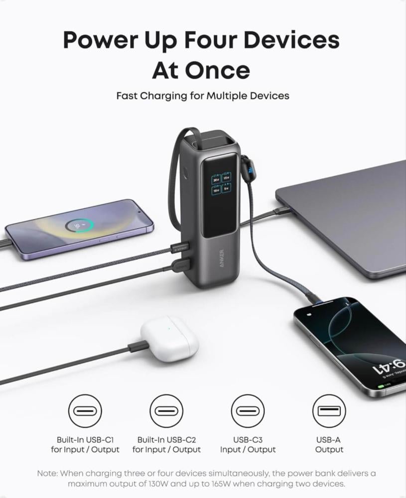 أصلي باور بانك أحدث إصدار من انكر 25 الف ملي امبير بسرعة 165w وحجم أصغر مع كابلات مدمجة وقابلة للطي